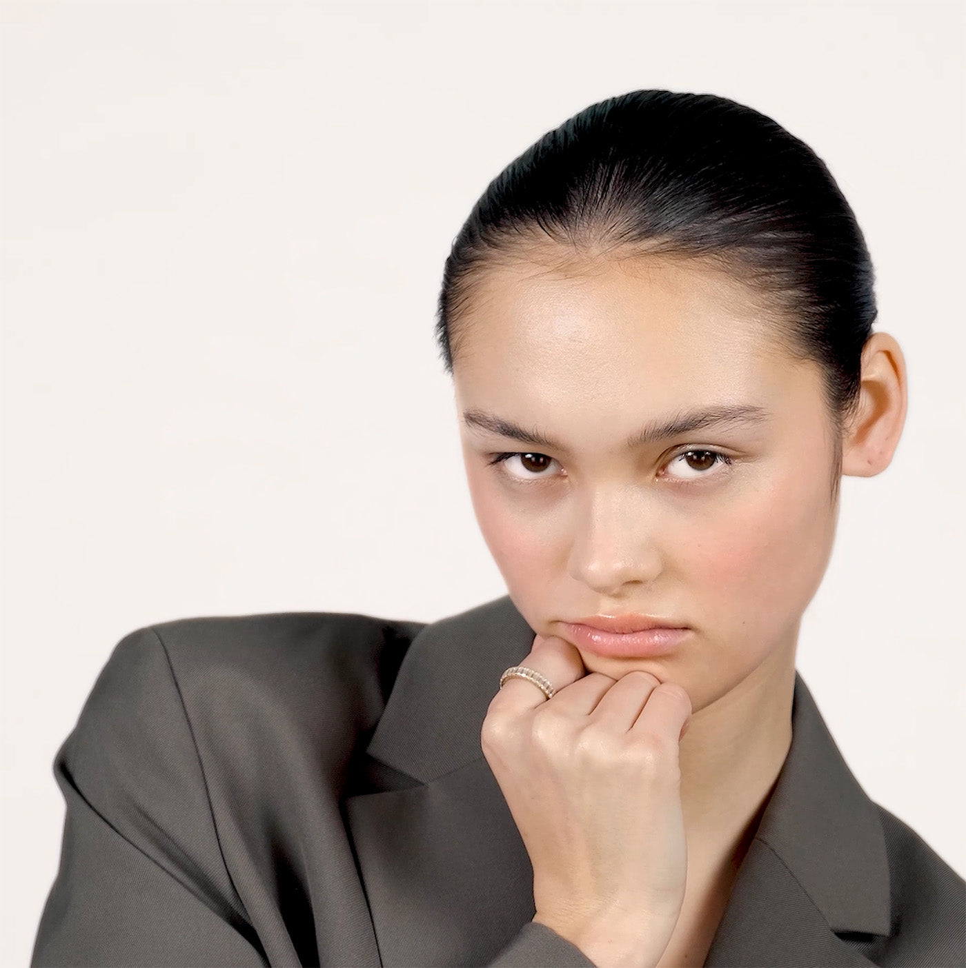 A young woman wearing a sparkly moissanite eternity ring on her index finger covering her left eye with her index finger.